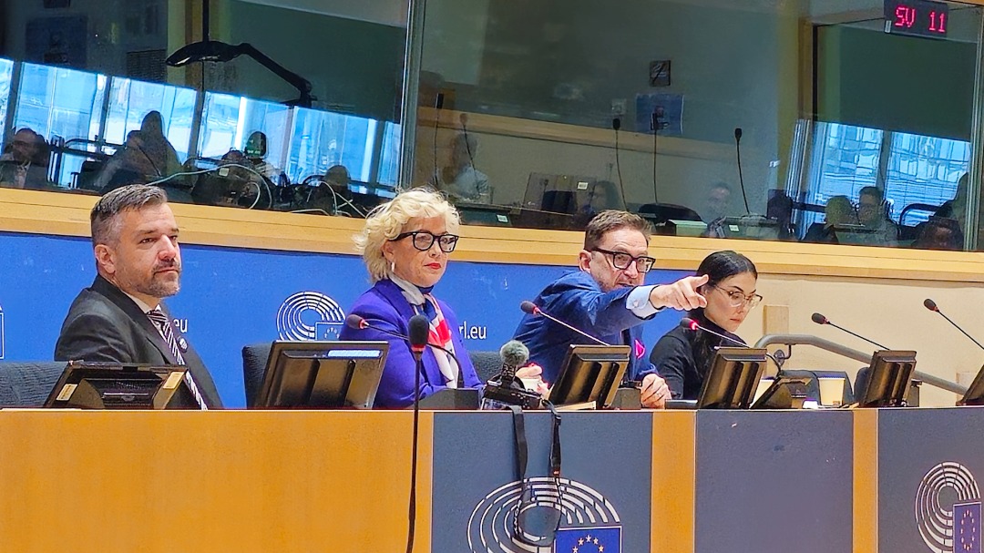 de gauche à droite : András László (MEP, Fidesz‑KDNP), Kellie‑Jay Keen (Posie Parker, founder of Let Women Speak), John O' Brien (head of communications, MCC), Dr Ashley Frawley (visiting research fellow, MCC Brussels)